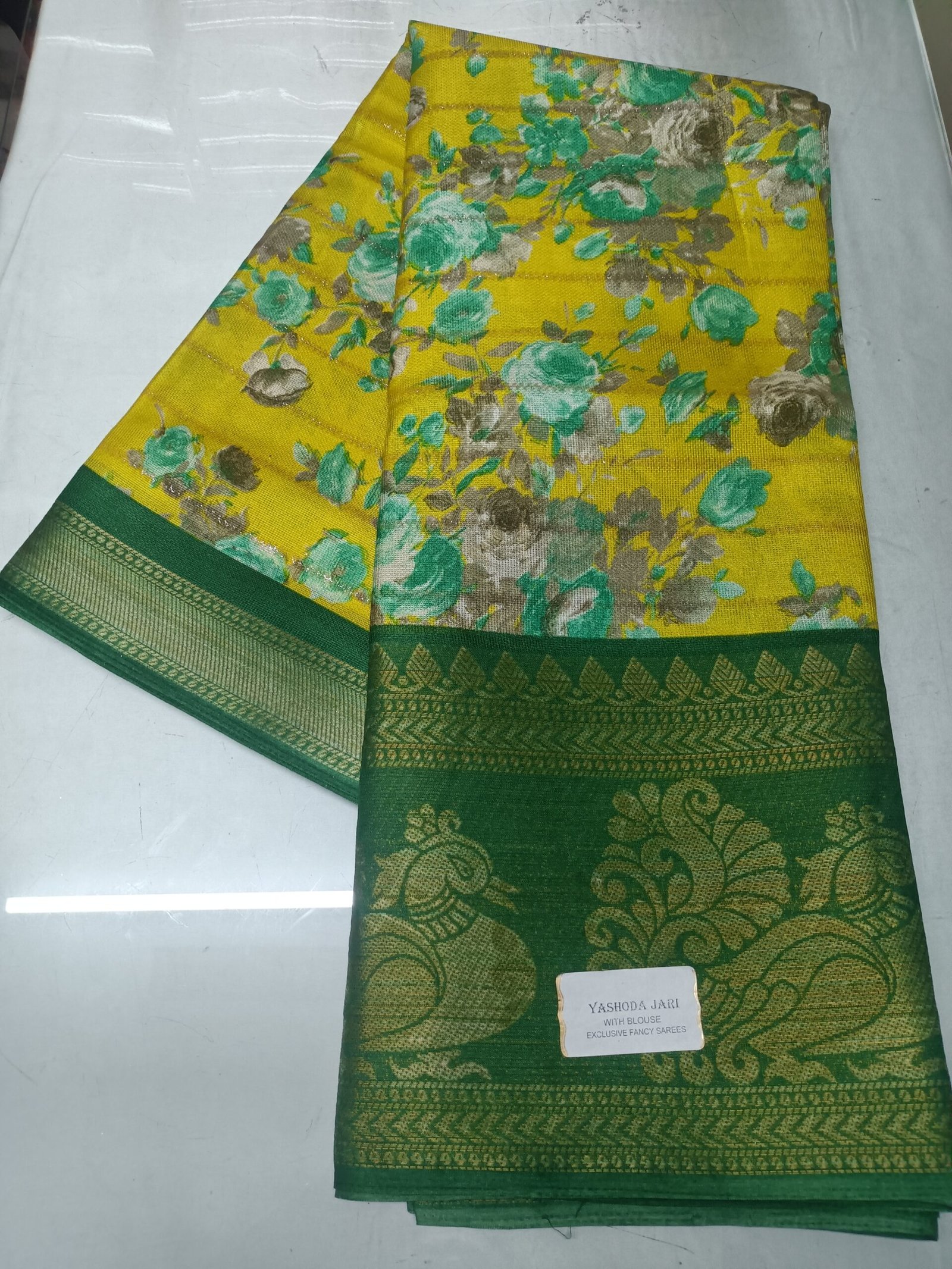 # Jari Exclusive Fancy Floral print and Peacock Border Saree With Blouse